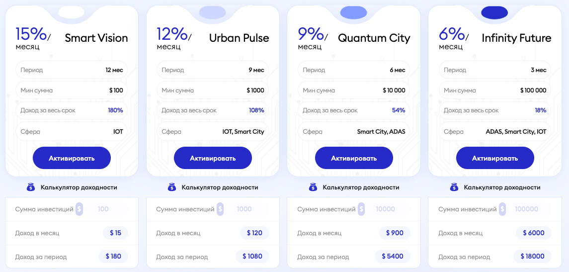 • Тариф Smart Vision, работает 12 месяцев, вклады от 100$, доход 15% в месяц, чистая прибыль за круг +180%