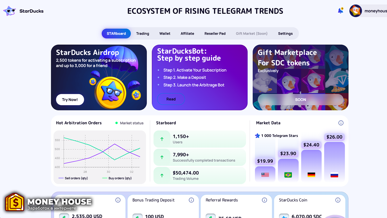 StarDucks – Свежий инвестиционный проект от зарубежной администрации, который запустился в ноябре 2025 года. Качественный сайт с продуманной легендой предлагает зарабатывать от 0.5% до 2% в день, причем тело депозита можно забрать в любое время без комиссии. Потенциальная прибыль с торгового баланса 32-45% в месяц + прибыль за счет сложного процента.